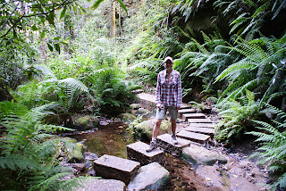 After breaky we had another look at Perry’s Lookdown before driving back to Blackheath via Pulpit Rock for more spectacular views of the Grose Valley. Next we drove out to Evans Lookout as we were recommended to do the Grand Canyon walk (5km loop – 2h). The walk goes down into the canyon where you look up to the sheer cliffs (difficult to catch on camera). Climbing up a rock to take a photo of Andrew crossing the creek on a log, Nele slipped (she hadn’t noticed the moss!) and grazed her arm and leg (and we are expecting a nice bruise on her backside tomorrow as well). Afterwards we left the Blue Mountains and set off towards Canberra. We stopped at Oberon for lunch and Goulburn to fill up with fuel and take a photo of the Big Merino. It was a very scenic drive to Weereewa Lookout at tonight’s rest area.
